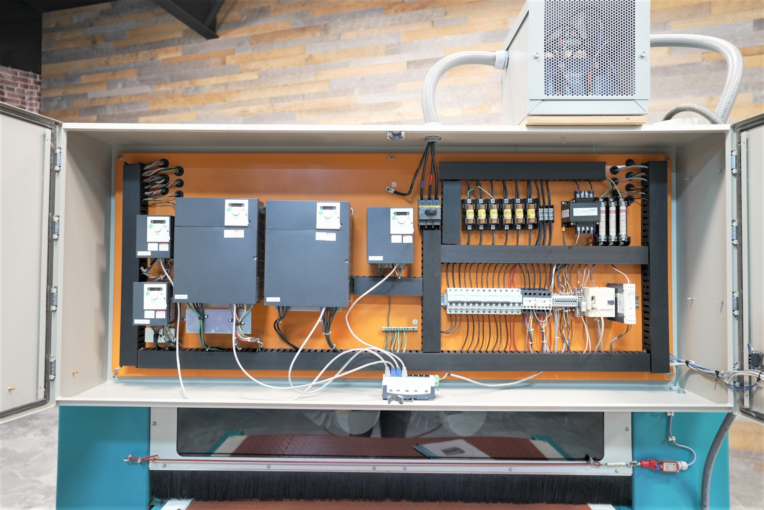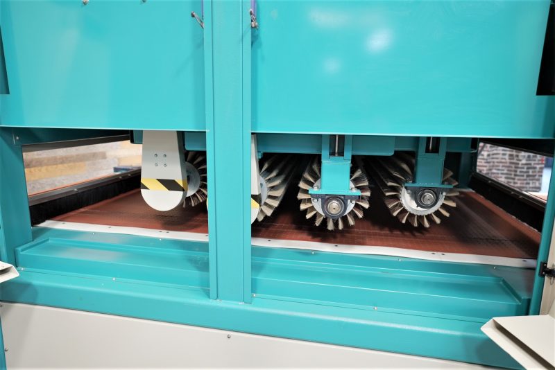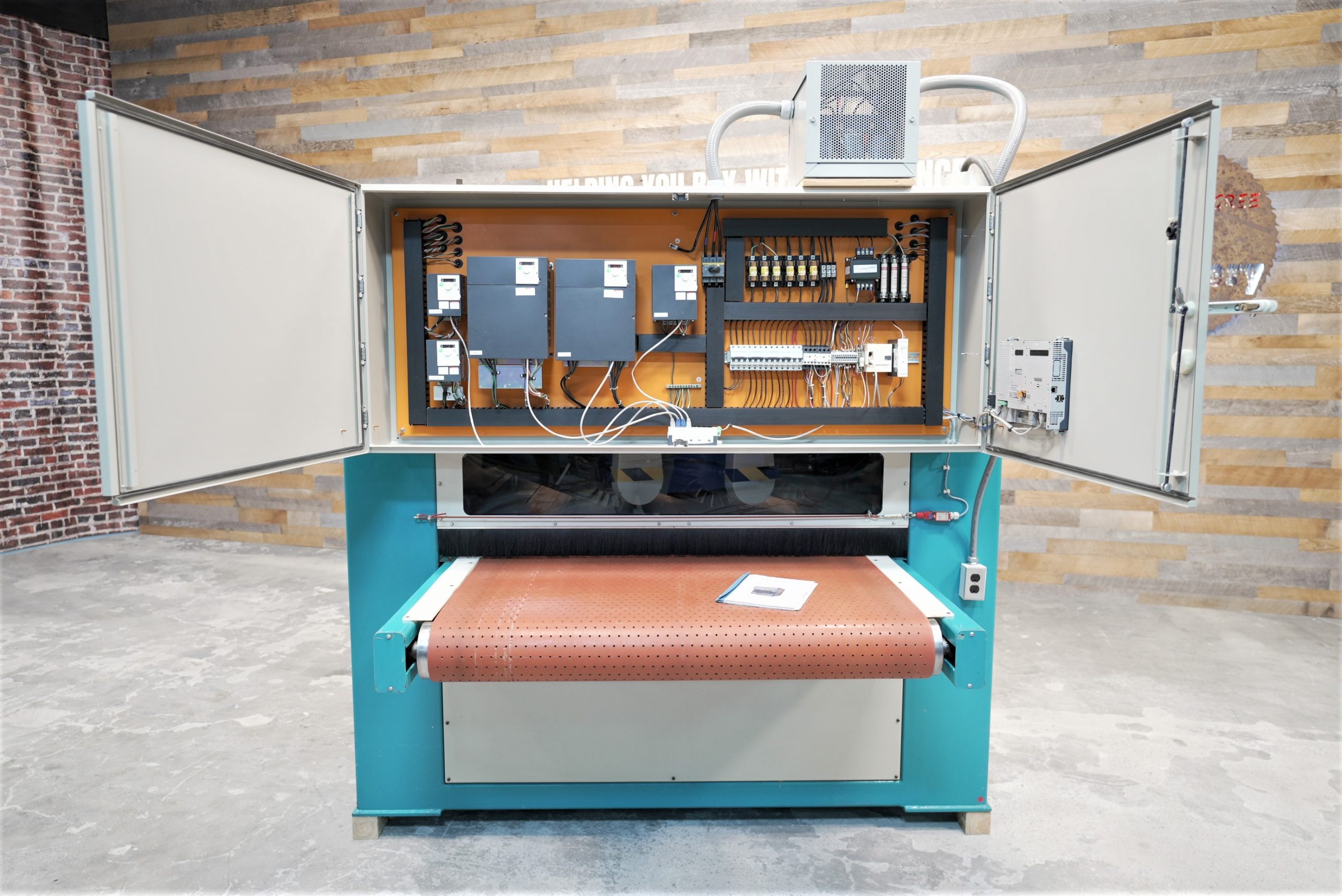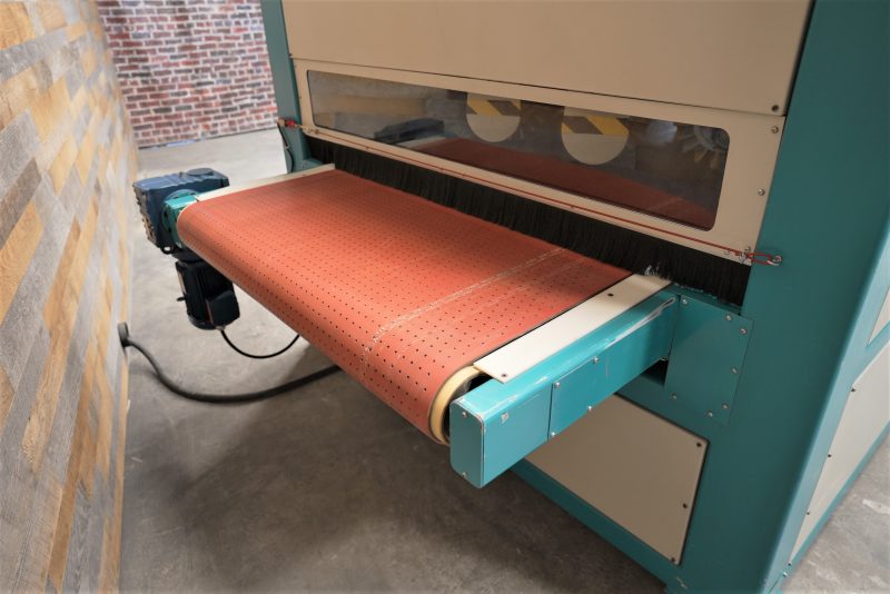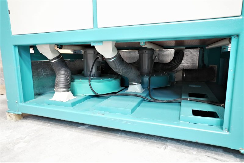 Feed system with vacuum conveyor belt feed, variable feed speed from 4 – 46 FPM, 3 HP feed drive with (2) 10 HP vacuum pumps & motors