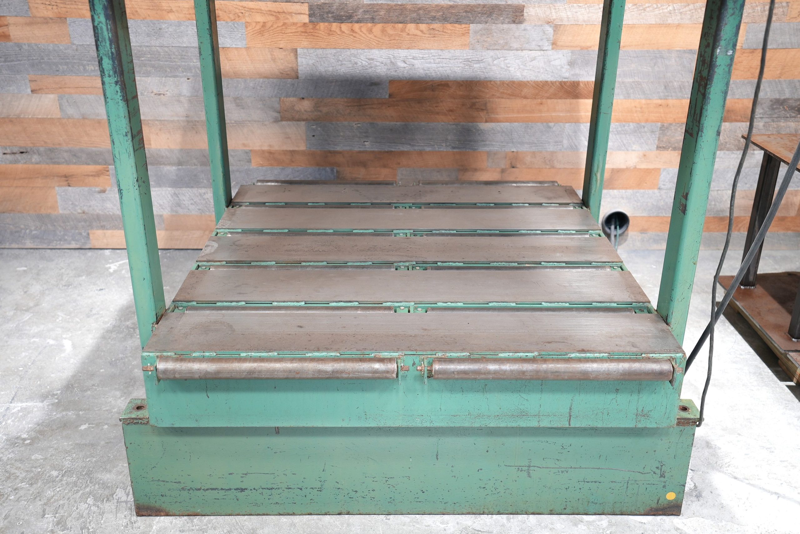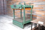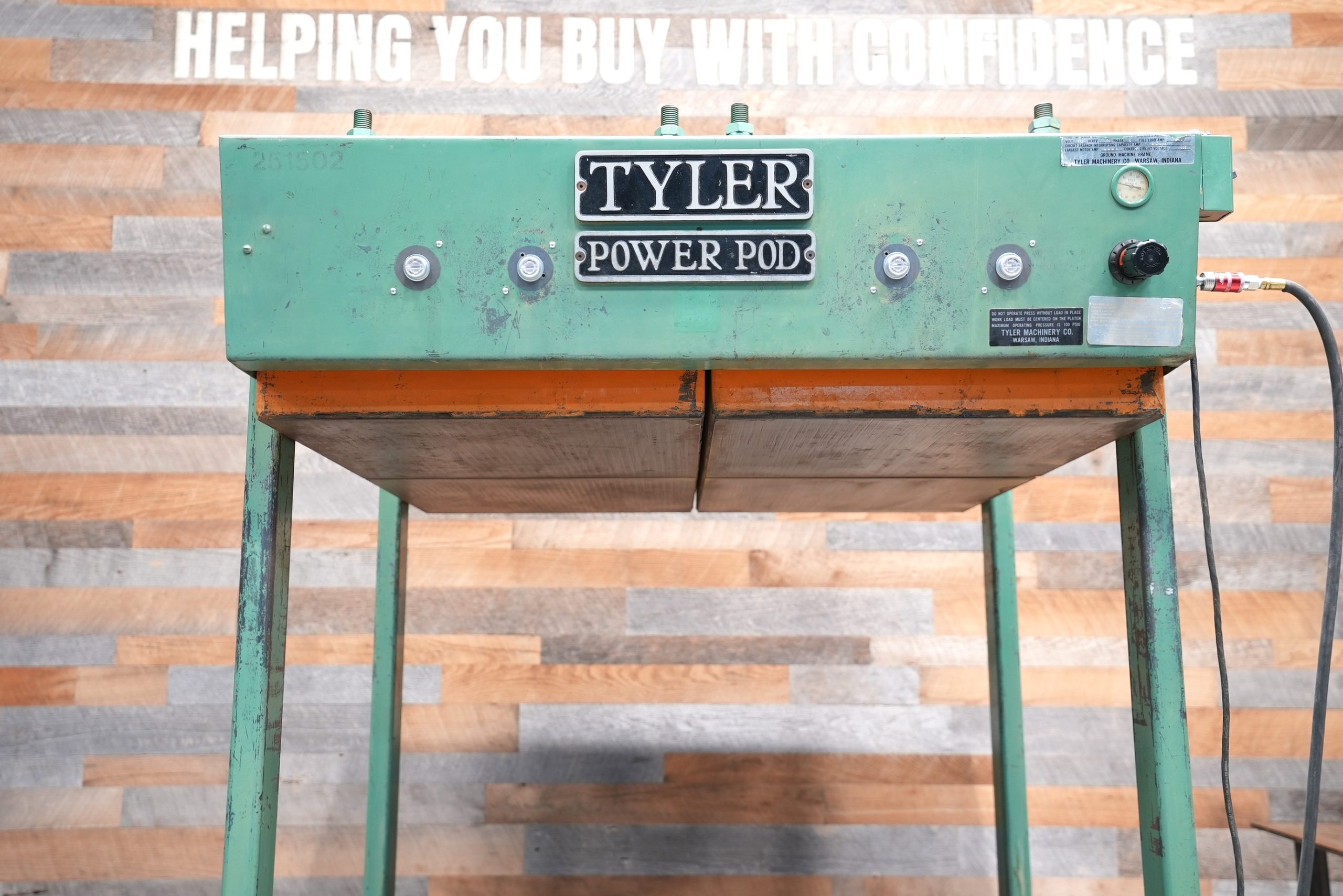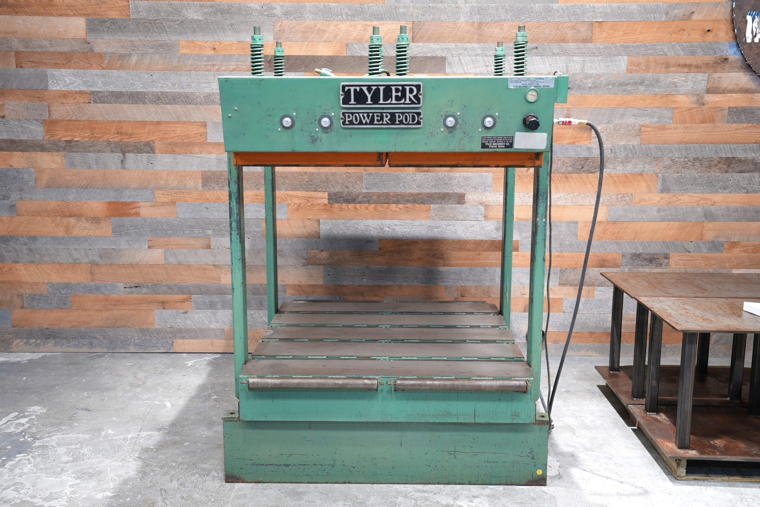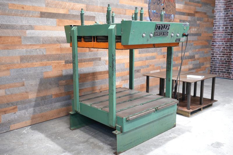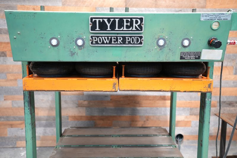 This is a hard to find “half sheet” Tyler 51″ X 51″ Power Pod Cold Press. There are a total of (16) 12″ pods and (4) 25″ X 25″ platens. So you have pretty much full pod coverage up top. Inlet max. pressure is 100 PSI, while this model is rated at 80 PSI according to the manual. It features a 36″ daylight opening, the bags have an almost 6″ max. stroke, and we do have a set of 24″ steel risers to bring the daylight down to 12″. Spring loaded lower rolls help aid in loading and unloading. Rolls are currently set below bottom plate and not being used. This press is air powered and only uses 115V to activate the bags via solenoid switches with each platen having it’s own switch.