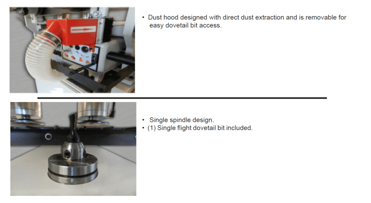 | Dust hood designed with direct dust extraction and is removable for easy dovetail bit access. |