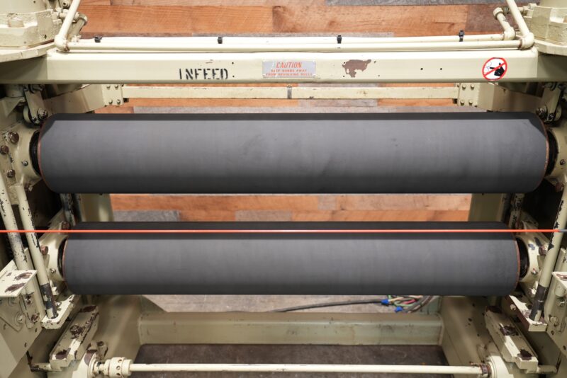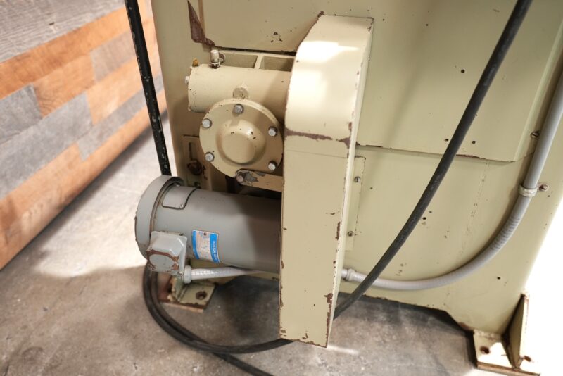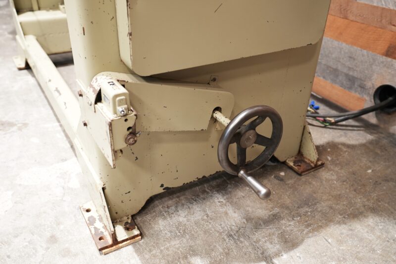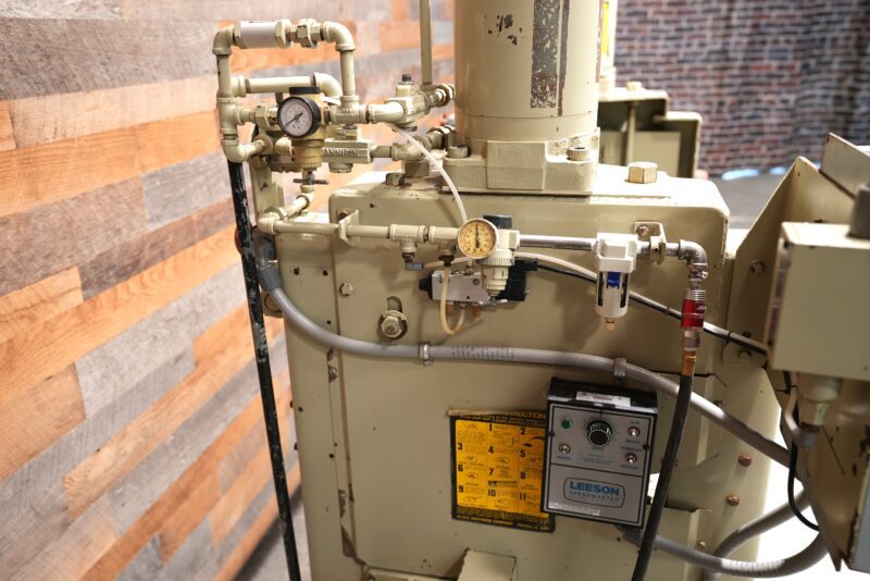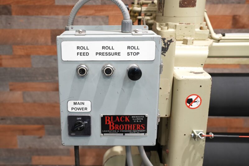 What can you say….it’s a Black Bros……this is a very heavily built 48″ pinch roller. (49-3/4″ actual width). The bottom roll has a fixed height of 33″ while the top roll lowers to the bottom roll pneumatically via dual 8″ X 10″ (body diameter & length) pneumatic cylinders. The max. daylight is 3-3/4″ while the min. is 0″ as the rolls will touch. The 8-1/2″ diameter rolls are in very good condition. Power is provided via a 1 hp motor with a Leeson Speed-master Speed Control featuring forward, reverse and adjustable speed.