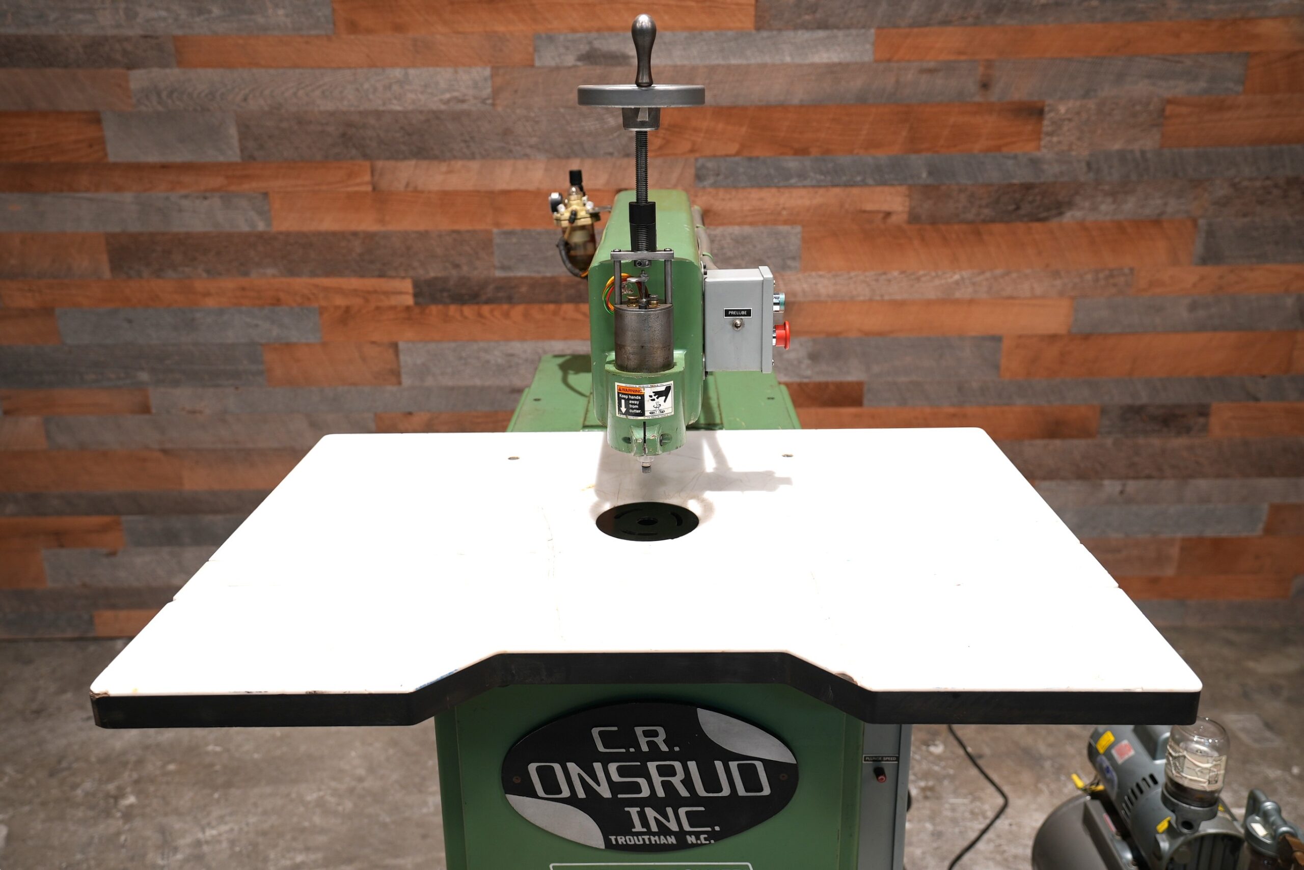 Onsrud 36210, 10 HP (230/460V/3-Phase) inverted pin router with a Gast 3/4 hp (115V) vaccum pump with tank. Pneumatic spindle and guide pin movement via foot pedal; 3″ spindle travel; 3-Position adjustable depth stop, infinitely adjustable. 3/4″ max. Chucking capacity and “Fog Mist” lubricated spindle system. 43″ x 31″ acrylic topped table, 36″ throat depth, 3-Position adjustable depth stop, infinitely adjustable; Maximum workpiece/template height is 4″.