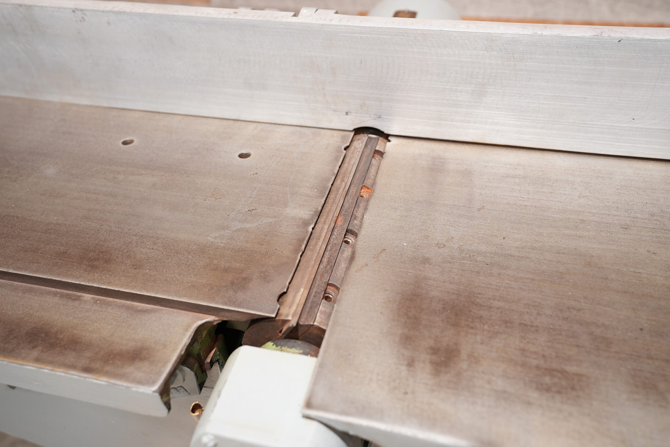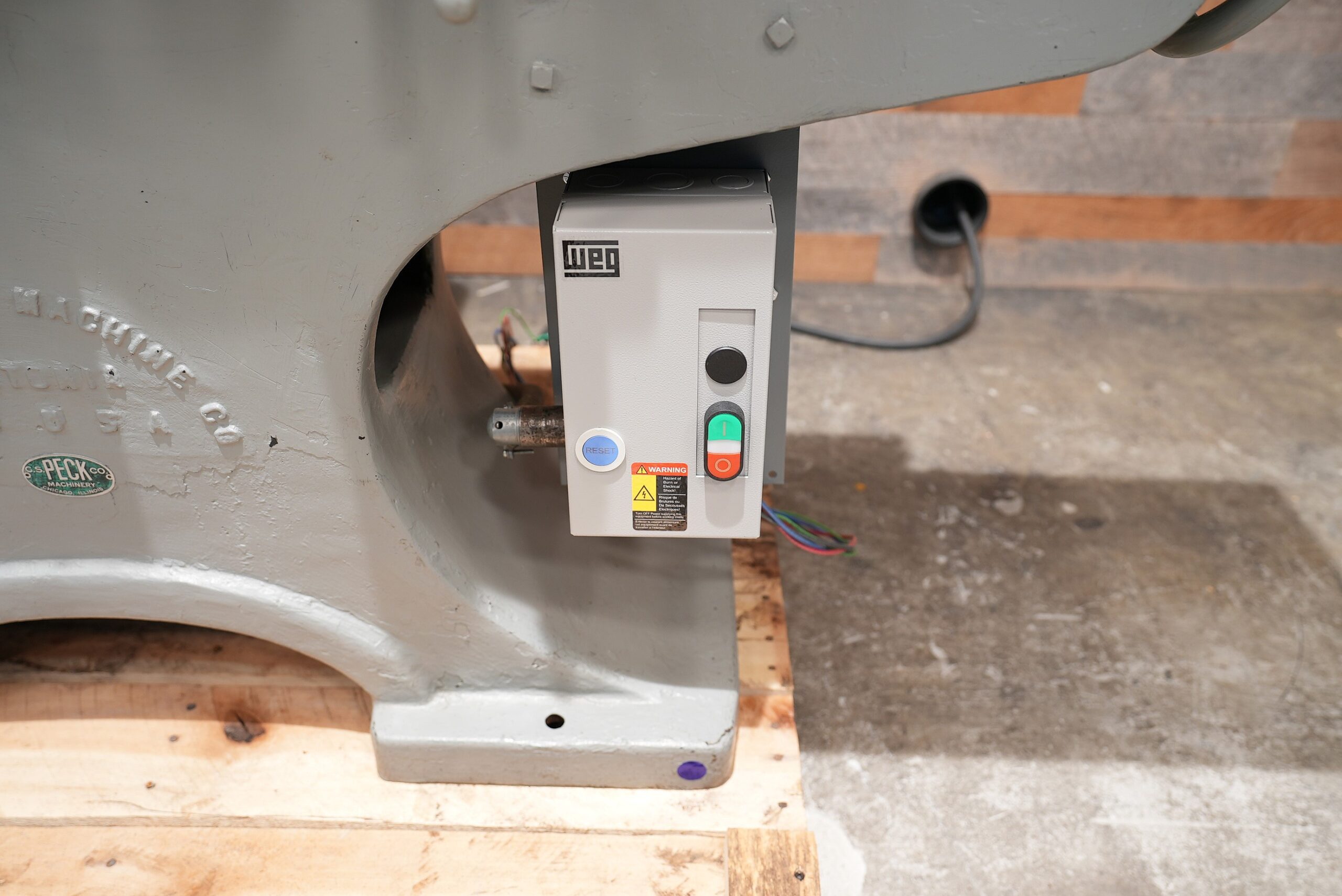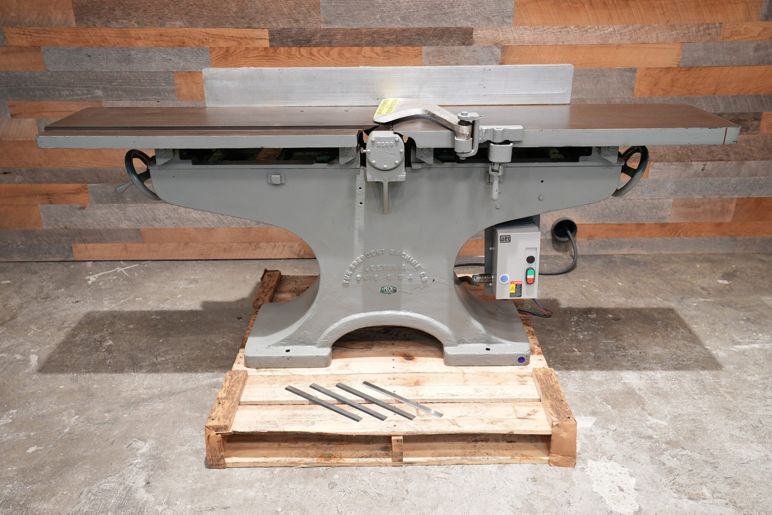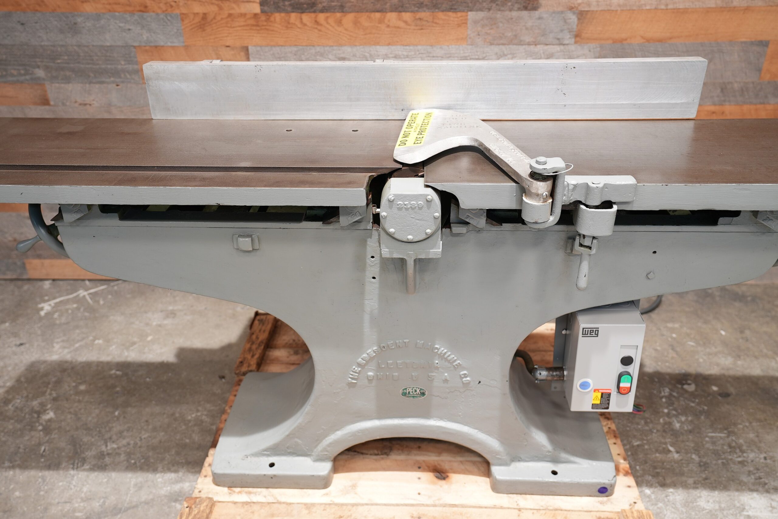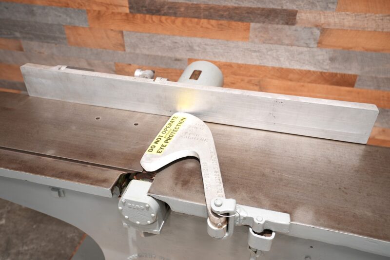 This is a vintage Crescent 12″ Jointer. The 4 hp direct drive motor spins a 4 knife cutter-head 3,600 RPM. Currently wired for 230V/3 Phase operation. NEW Weg starter. 83″ combined table length with the gap. Tables are 40-1/2″ long individually. Outfeed table looks like it may have been pitted at some point in it’s like. Tables are flat. We pulled this from a local pattern shop.