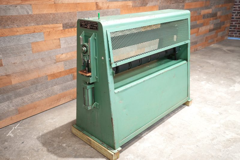 This Evans model 200 has a 52″ max. width capacity and 5″ max. daylight opening. Rolls are in very good condition. The lower roll is an adjustable segmented roll allowing for build down.