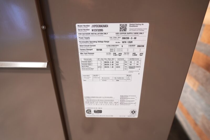 We purchased this Johnson Controls 10 ton state of the art Central Cooling Air Conditioner along with a 15. We ended up not needing this 10 ton unit and it is NEW and has never been used. It consists of a model J10NMC00C2BAA3 air handler and model J10YDC00A2AAE4 condenser. The condenser has (2) 5 ton compressors. This allows the unit to cool fast and use both compressors but also be able to maintain and save money by using a single compressor at a time. It also has a variable speed fan. We are able to get humidity down to 51% @ just 73 degrees with the 15 ton unit we have installed! Absolutely amazing! Plus very cost effective to run at 208-230V/3-Phase. Uses R410A