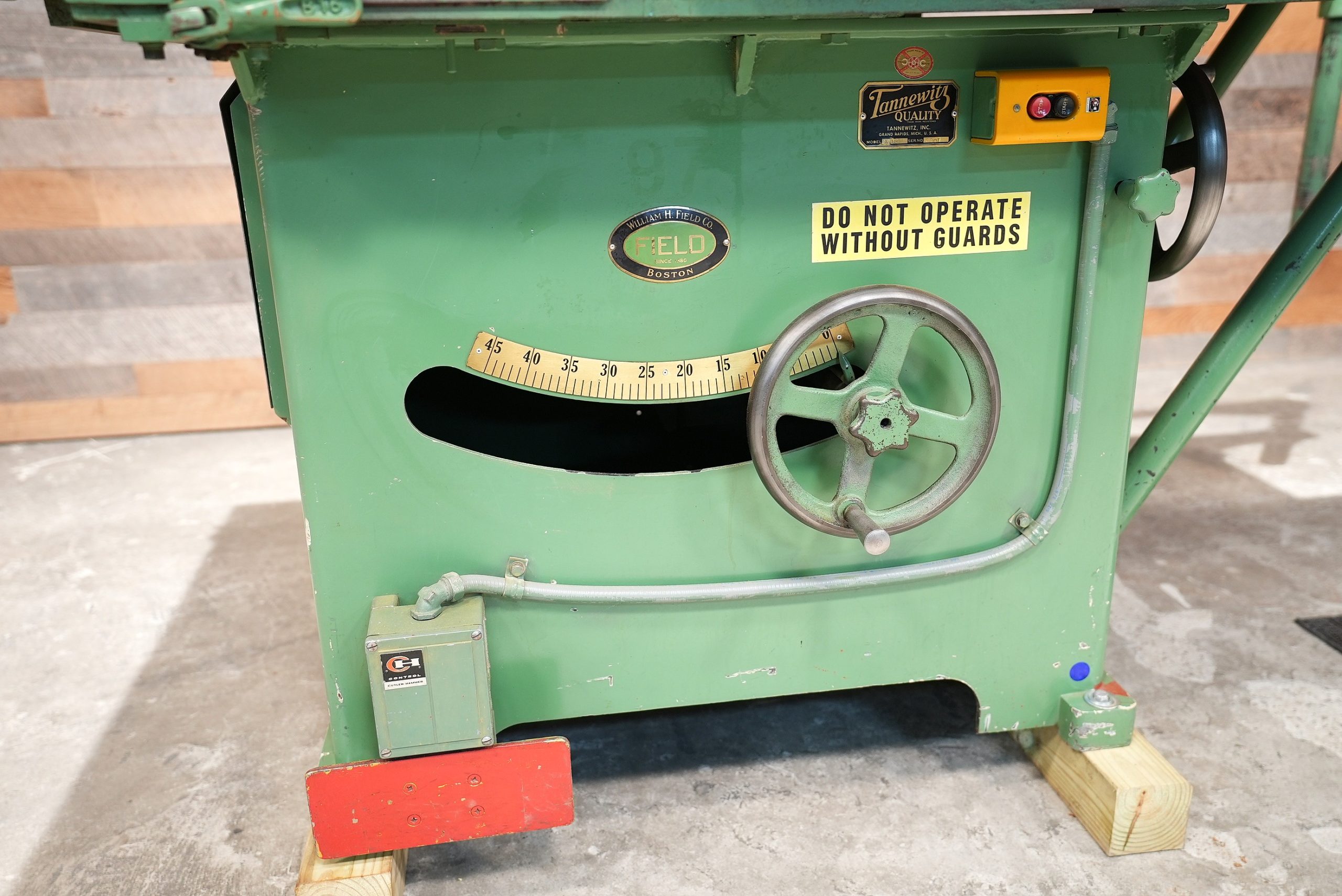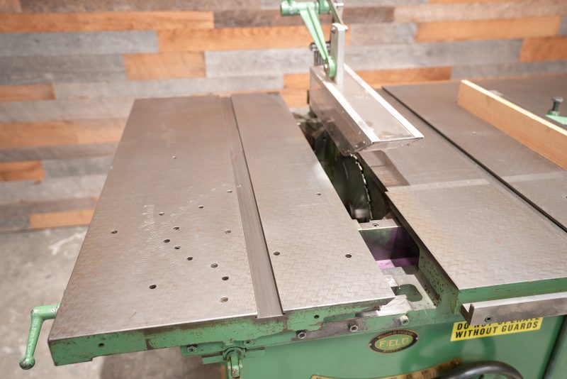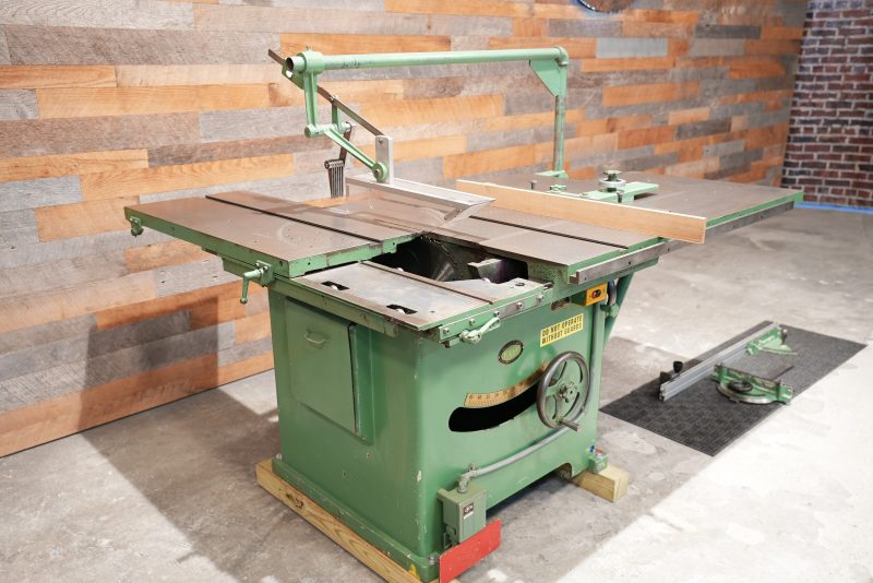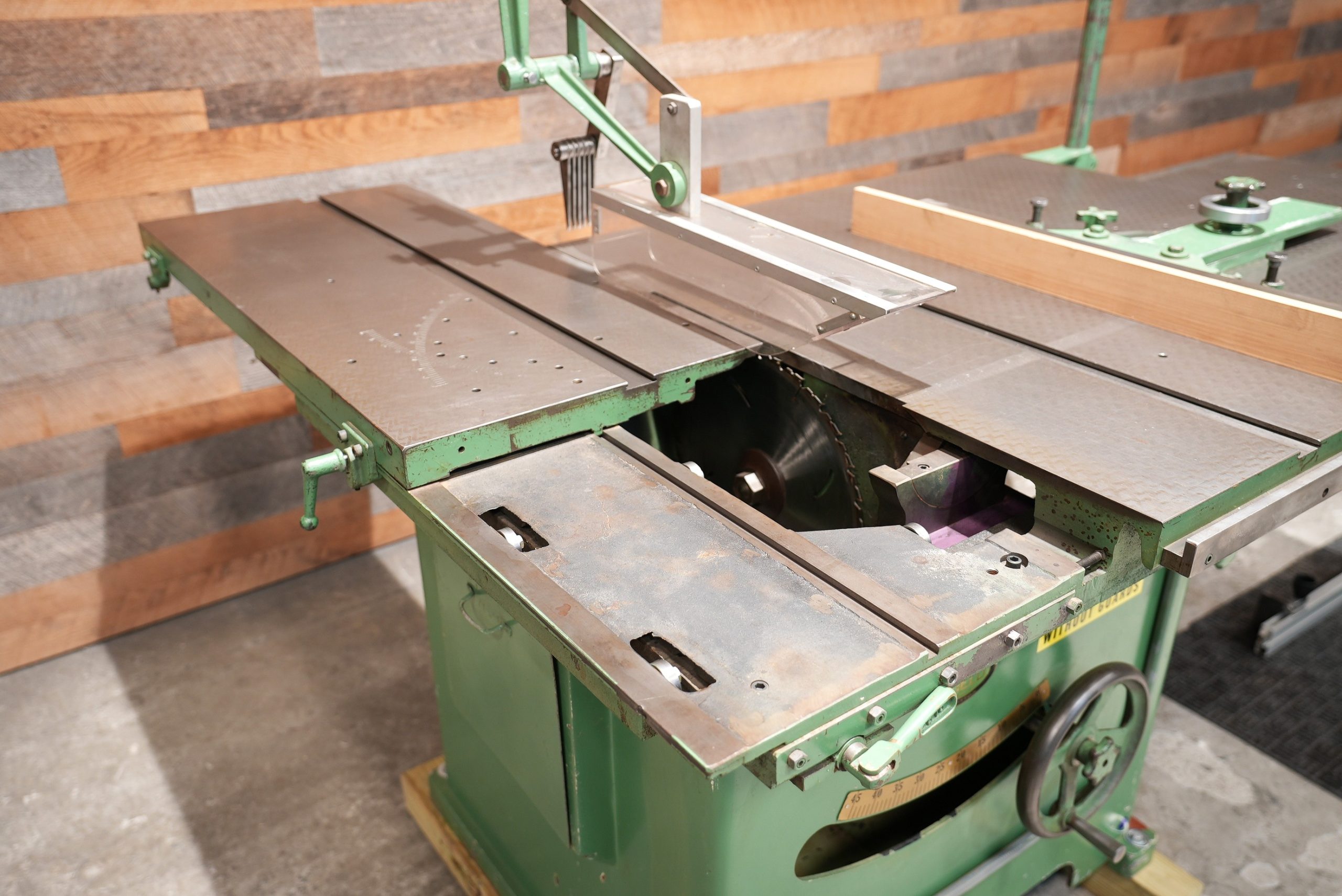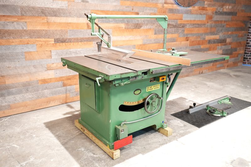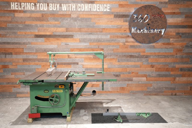 I don’t know what makes this such a rare saw……the fact that it is a XJSW or the condition it is in which is beyond EXCELLENT for it’s age. Obviously the first thing everyone notices is the cast top. Beautiful relief pattern ground into the full surface. The XJ was the top-of-the-line Model variety saw from Tannewitz. The XJSW was the largest saw available from them with a single arbor. XJ is the Model designation, S designates ‘sliding’, and W for wide table extension. This one has the original pin set fence, (1) miter gauge, and the angle fence. It’s 5hp with a 16″ blade capacity. It’s wearing it’s original paint, has the original over head blade guard. Amazing condition!