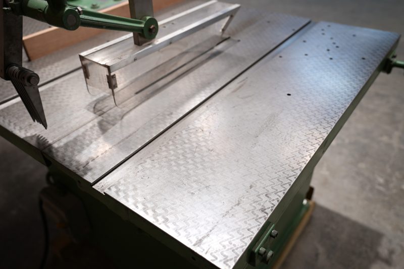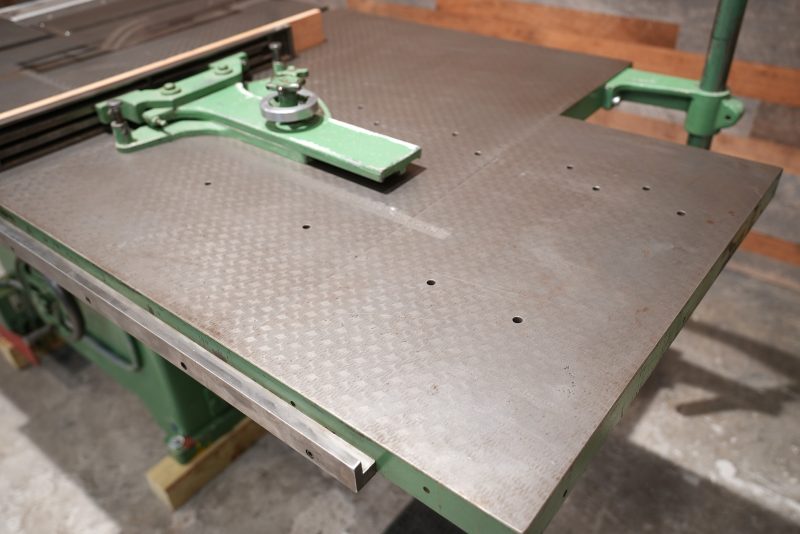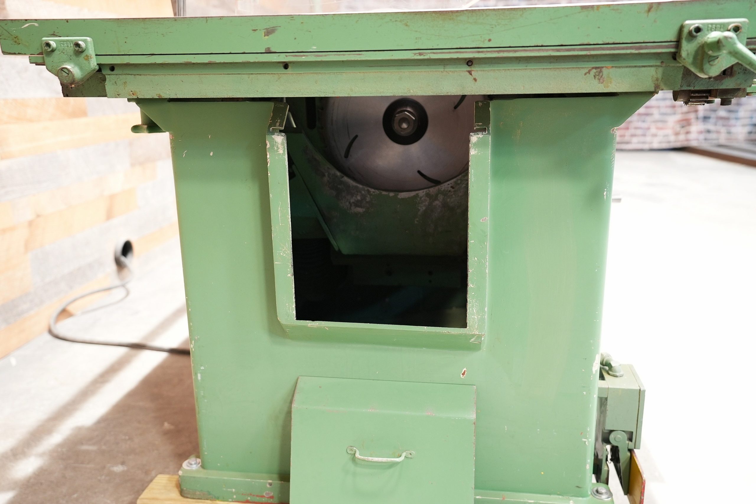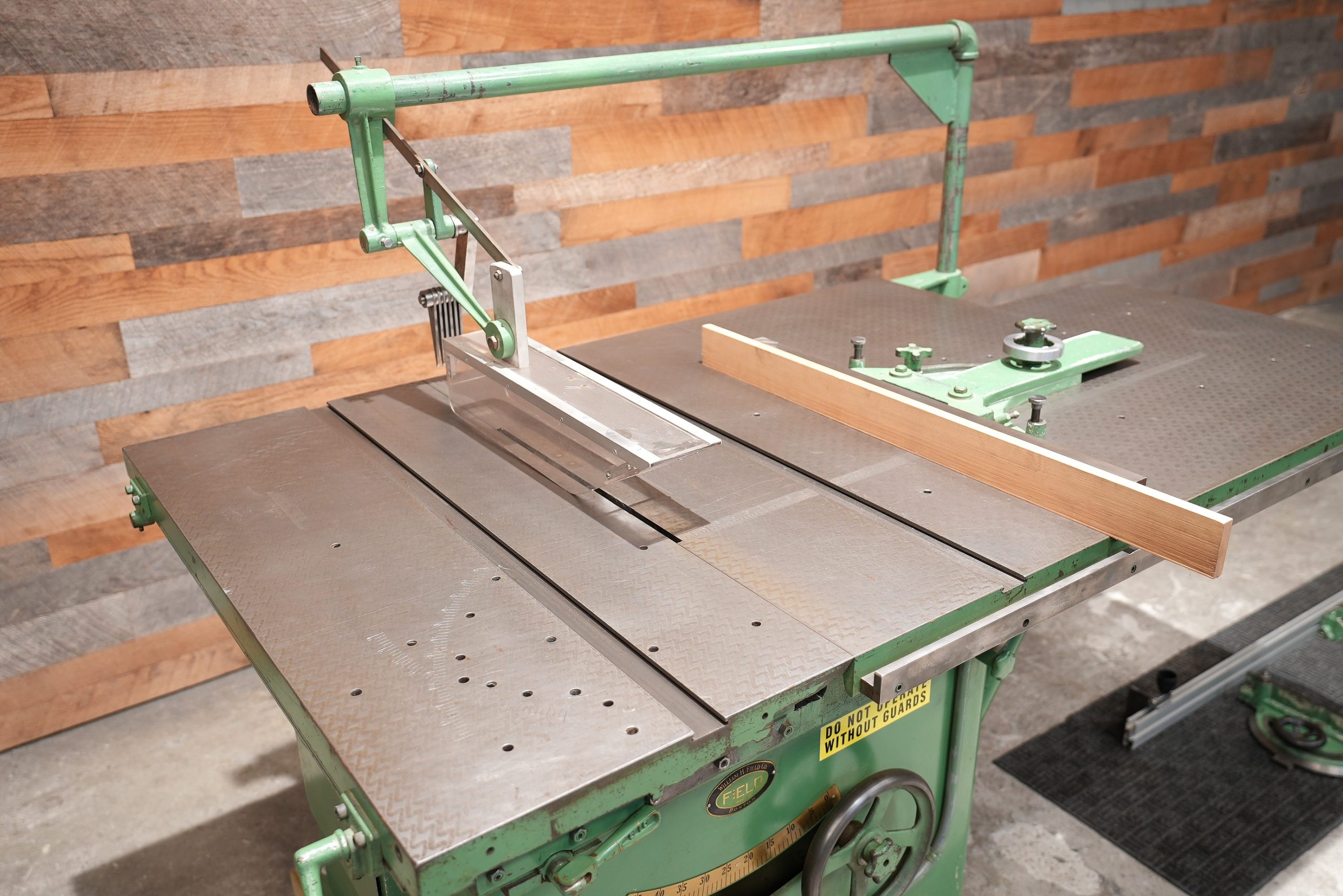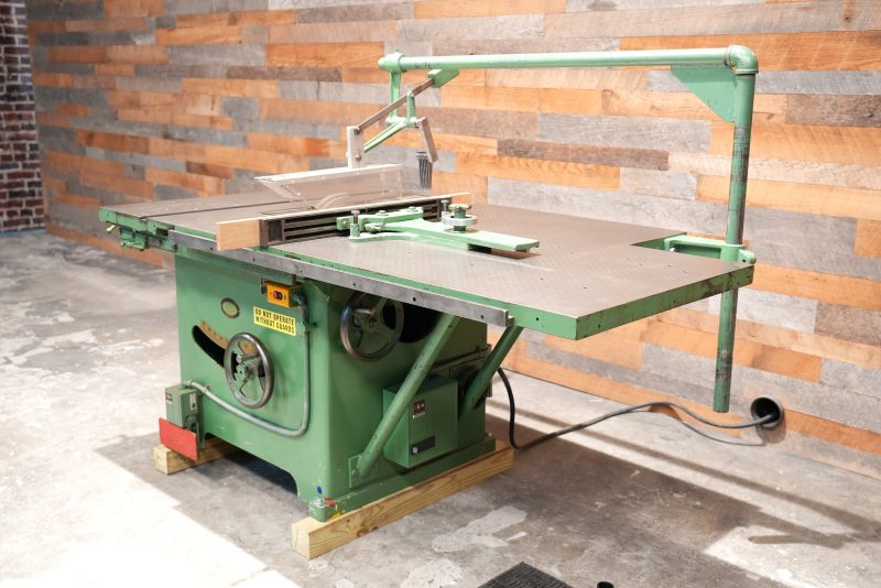 I don’t know what makes this such a rare saw……the fact that it is a XJSW or the condition it is in which is beyond EXCELLENT for it’s age. Obviously the first thing everyone notices is the cast top. Beautiful relief pattern ground into the full surface. The XJ was the top-of-the-line Model variety saw from Tannewitz. The XJSW was the largest saw available from them with a single arbor. XJ is the Model designation, S designates ‘sliding’, and W for wide table extension. This one has the original pin set fence, (1) miter gauge, and the angle fence. It’s 5hp with a 16″ blade capacity. It’s wearing it’s original paint, has the original over head blade guard. Amazing condition!
