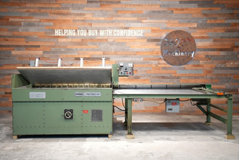This Raytherm Panel Master 88 Feed through Radio Frequency Gluer has a 92″ X 44″ (Top Pressure Plate) over all capacity and a 88″ X 40″ Lower RF Plate. It comes with a motorized matching infeed table. (14) rear mounted pneumatic pushers provide edge pressure while (4) upper pneumatic cylinders provide top pressure for flat panels. Motorized infeed is powered by a 3/4 hp to load panels in the RF Gluer. This machine is wired for 220V/3-Phase power @ 80 amps.