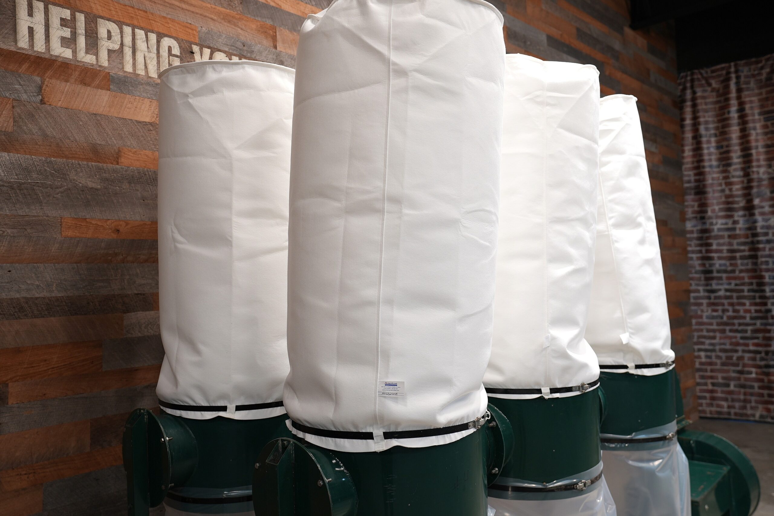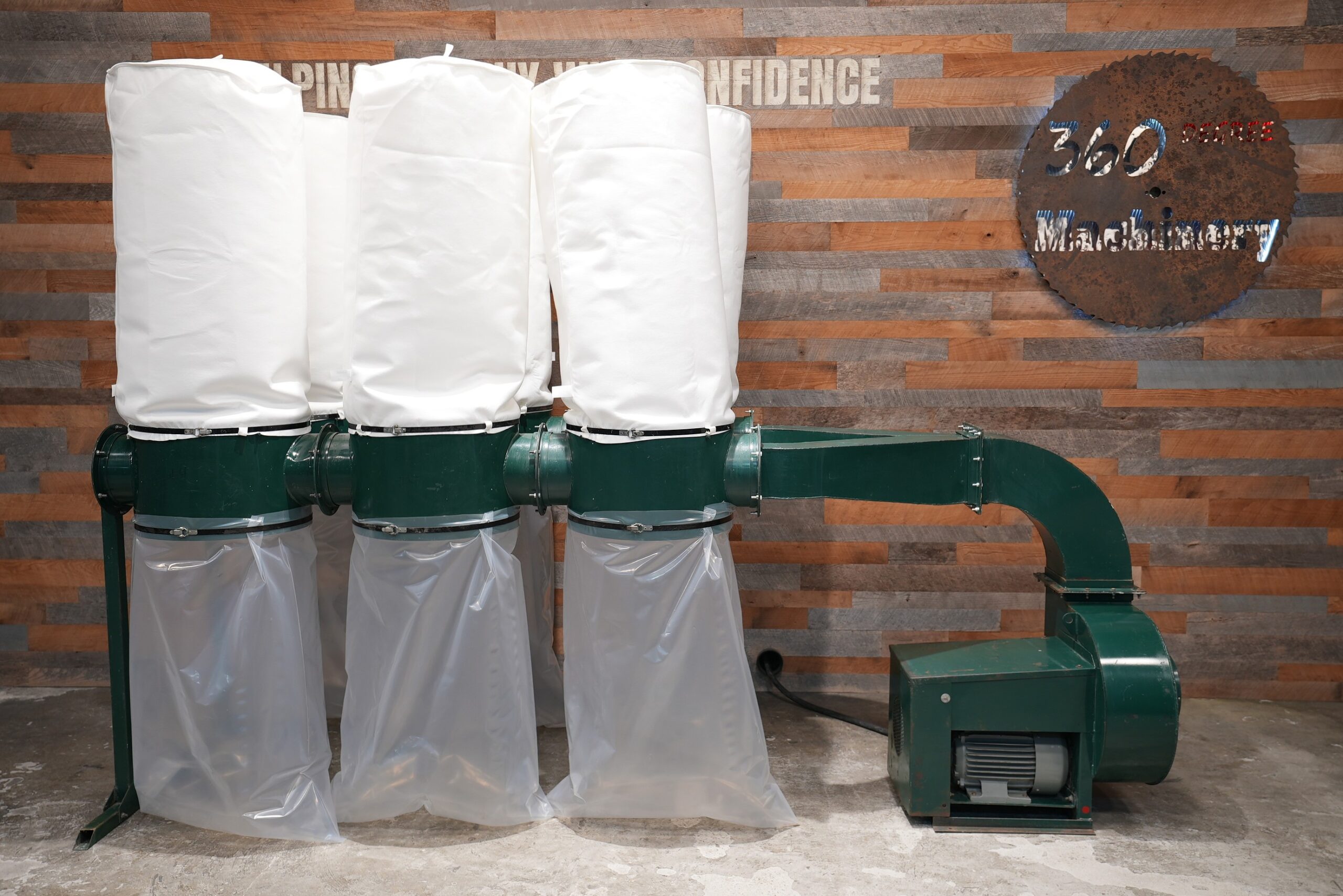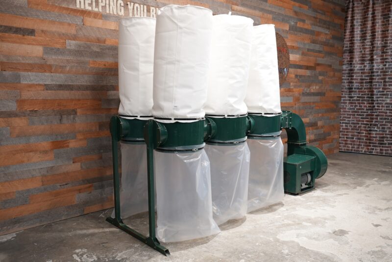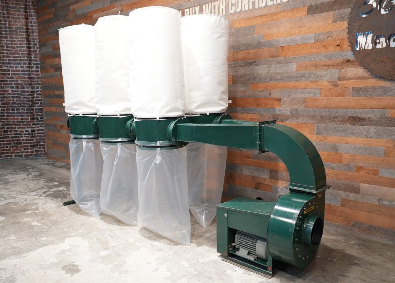 This is a pretty straight forward affordable 4,000 CFM dust collector. It’s powered by a 10 hp (230/460V/3-Phase) fan with an 11″ inlet. (6) total discharge plastic bags on the bottom and (6) NEW American 24″ X 48″ filter bags up top. This Reese is 150″ wide, 54″ deep and 105″ tall approximately.